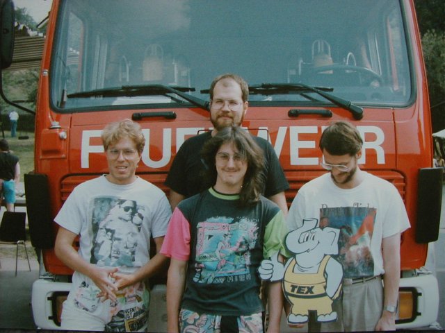 The Exceptions and a Fire Truck. Left to right: Michael "Daryl" Raasch, Erik "ES" Simon (in the rear), Jochen "Mad Max" Hippel and Udo "-me-" Fischer.
