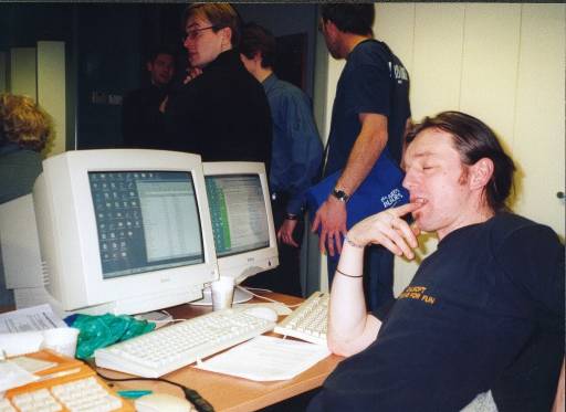 Around the PHF's whereabouts. Left to right: The back of Wingleader's head, a distant guy in the darkness, Xbios Man, Dim of the Overlanders (in blue), someone else of the Overlanders, Cal of PHF.