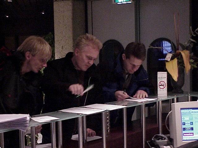 The entrance, the first Germans start arriving on Friday night. Left to right: Andreas "Ilja of Level 16" Franz, ?, Gunther "6719 of TEX" Bitz.