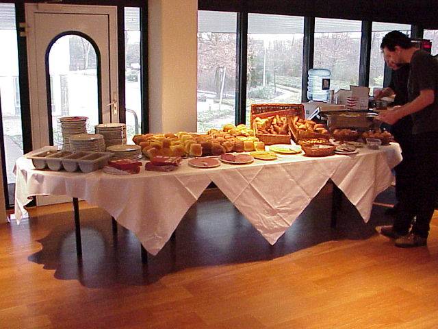The restaurant. Breakfast presentation. The guy standing in the front at the right is NEXT's Dbug. Maybe we will one day be able to identify the other guy who is largely obscured.
