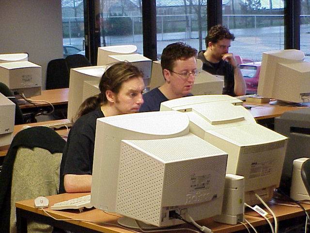 Room 2.01, PHF. Left to right: Mike "Cal of PHF" McAllister and Grazey, working hard to get their 7-disk "Ultimate Muzak Demo 8730" finished so it can be entered in the 'General Demo' coding competition. Alex "TNS of QX" in the back.
