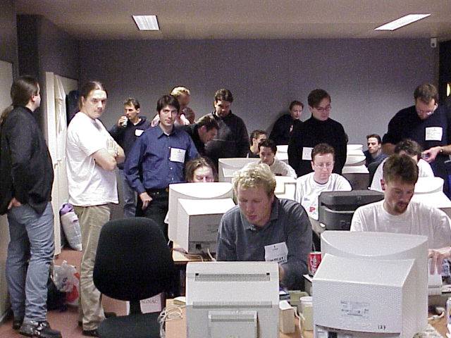 Left to right: Perceval of Zuul, Stefan Posthuma, Robbert van Dalen, Dim of Overlanders (blue shirt), Klaus Berg (drinking), Fabrice Odero (bent), Cal (top of head above monitor), Alex "TNS of QX" Crouzen, Wingleader (wild-haired in the front), Jeroen van Dinther (dark hair, head visible, sitting behind computer), Jalden of Undead (obscured face behind Jeroen), Zappy (hanging against back wall), Xbios Man of Overlanders (standing with glasses), Grazey of PHF, Elric (just the head, in the back), Alexander de Vries (in the front, with beard and moustache), Mr. Bee (face obscured behind Alexander), someome (standing, looking intently at something).