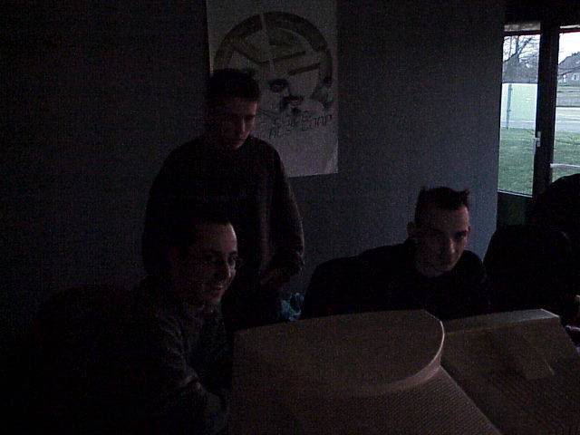 Musicians together, a bit underlit, Sunday morning. Left to right: Jochen "Mad Max" Hippel, Jan "Milhouse" Dildrup, Stefan "MC Laser" Benz.
