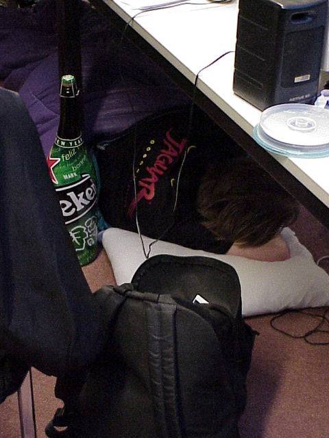 The auditorium, Sunday morning (another part). Unidentified person with a seriously cult T-shirt dreaming...possibly of a world not infested by Micro$oft, where the Tramiel family are the richest people in the world.