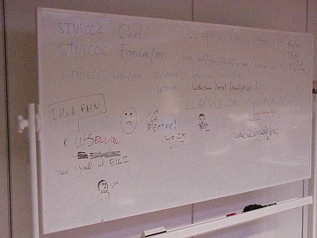 The whiteboard in the auditorium. By the quality of the drawings and miscellaneous other scribblings you can see that the creative people had better things to do for the past few days.