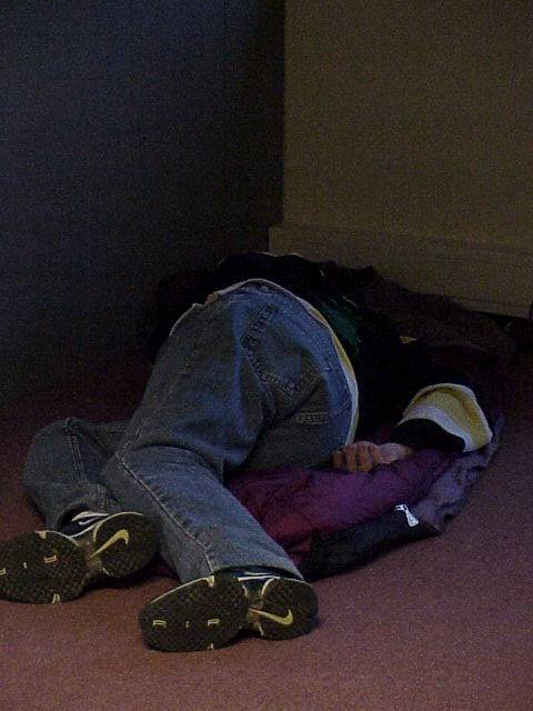 Somewhere, early Sunday morning. I was surprised to see him walking around later that day, because he doesn't look asleep (rather, dead). For those who don't recognise him, it's Chuck of Dune.