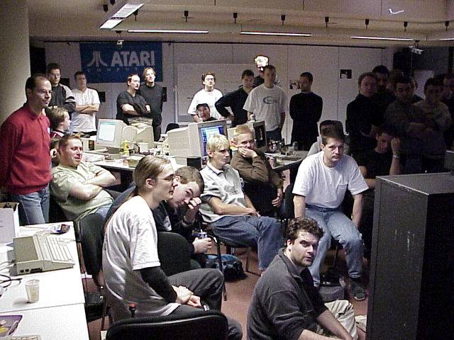 Left to right: Gunstick of ULM (red sweater), Photon of Lazer (dark clothes, arms crossed), Daryl of TEX (sitting in front of Gunstick, arms crossed), ? (sitting behind Daryl), ? (standing next to Photon), ? (standing next to tIn in front of the Atari banner), tIn, D-Force of Fun (standing in front of the whiteboard), Mad Butscher (sitting in front of D-Force), ?, ?, ?, ? (all four standing together to the right of D-Force), five or six unidentifiable people standing at the right, in the dark. Sitting in the front, from left to right: ? (from Fun), Carbon, Ilja of Level 16, ?, 6719 of TEX, possibly Tyrem of The Respectables sitting behind 6719, Hawkmoon of The Respectables touching his own face. Way in the front, looking cross or something, is The Nutty Snake of Quartermass Xperiment.