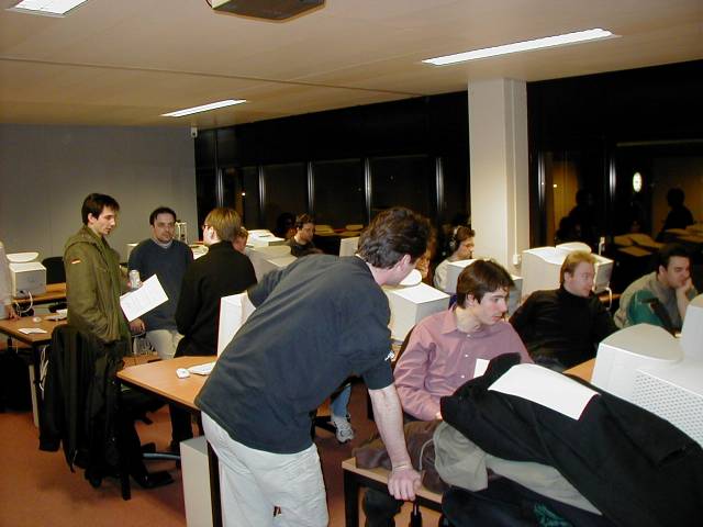 Left to right: Ben of Overlanders, Fulbert "Elric of Holocaust" Boussaton (sitting on table), Xbios Man of the Overlanders (with glasses), tiny part of the head of Mysteria, TNS, Jalden of Undead (talking to Dim), ? (tiny part of face visible), "Piotr with the Headphones", Dim, Pierre "Zappy of Holocaust" Terdiman, Alexander Holland.