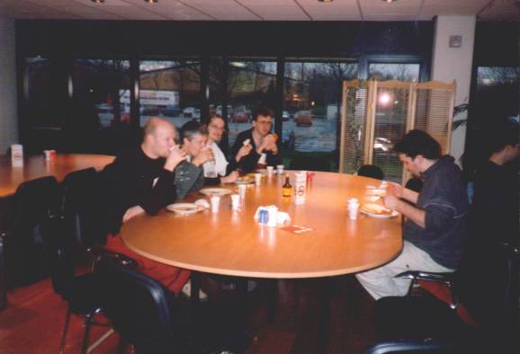 Table full of Dutchies. Left to right: Rob "Homeboy of the DDC" van der Haar, Arnout "FlyGuy of DDC" de Vries, ?, Hans "Mr. Ni! of TOS Crew" Wessels, Alex "TNS of QX" Crouzen.