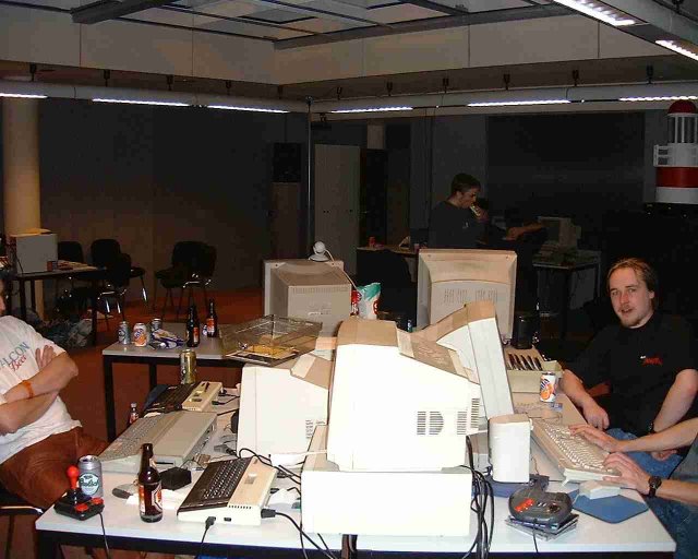 The auditorium. Left to right: Mad Butscher, Milhouse (in the back), ? (next to Milhouse), ? (black shirt with red logo), ? (arms only).