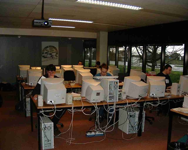 Room 2.03. Left to right: Sietse "Slimer of DBA" Postma, MC Laser (way in the back), Ray (next to MC Laser), Felice of Maggie, Carbon.