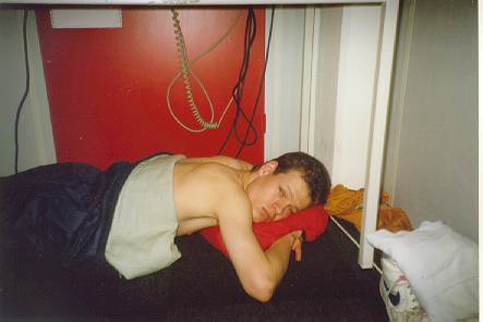 Half naked German snoozing near a pair of smelly sneakers under a computer table - Markus "Shadow of Dynamic Duo" Lynn.