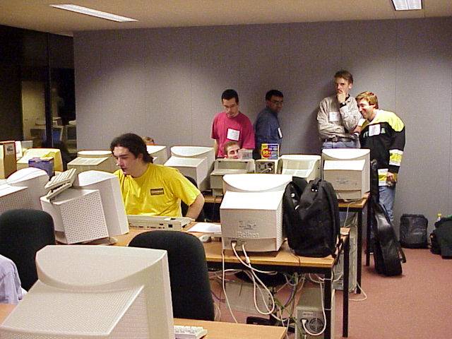 Room 1.06 quickly became a Frenchie stronghold. I remember that one of the guys who is responsible for the hardware side of things became very nervous when these guys sat themselves down the way they did. Left to right: Zerkman, part of the top of the head of Frost, Dma-Sc (standing in the pink shirt), EdO (sitting in front of the pink shirt), Mic, Alain Derpin, José "Chuck of Dune" Martins.