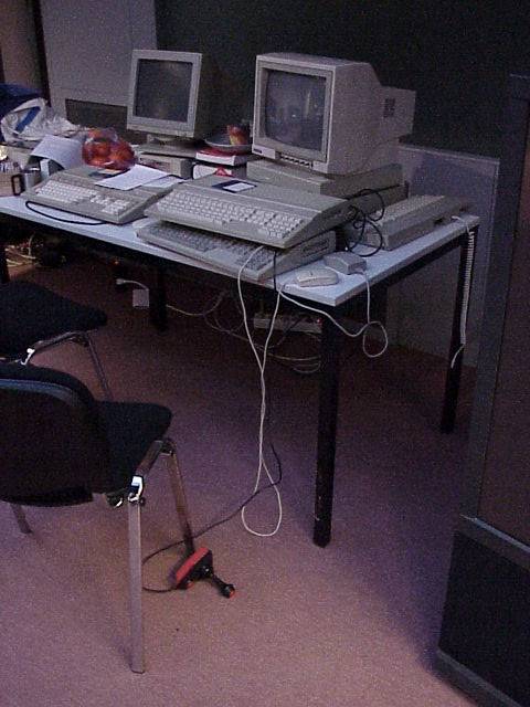 Early on Sunday morning there was preciously little activity (except for the Frenchies Stronghold, where they were still working to meet the deadline). Mr. Ni! of TOS Crew, for example, had gone off to pray to Morfeus so I could take this shot of his Falcon/1040ST setup.