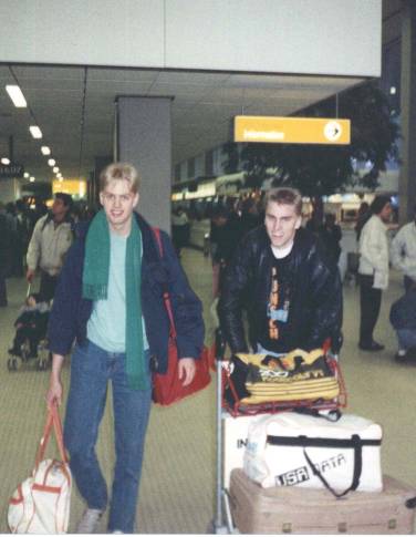 A CareBear arrives at Schiphil Airport. Anders "An Cool" Nilsson (right) is accompanied by a fellow Swede whose name eludes me.