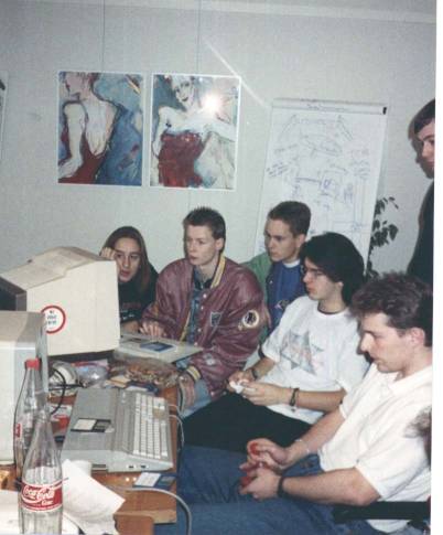 The TLB and TCB Room. Left to right: Sprog (TLB), a member of the Powerslaves (an Amiga crew, actually...), ?, Spaz (TLB), ? (playing), Rob Povey (author of "Quartet", his face just visible).
