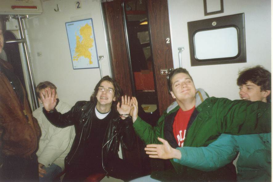 The day before the convention: Left to right a part of someone who might be Tanis, then Jas (functionally obscured by Spaz' hand), Spaz, Stefan "Digital Insanity of TLB" Posthuma and Fabian "Oxygene then-of-TLB-but-later-of-Delta-Force" Hammer.