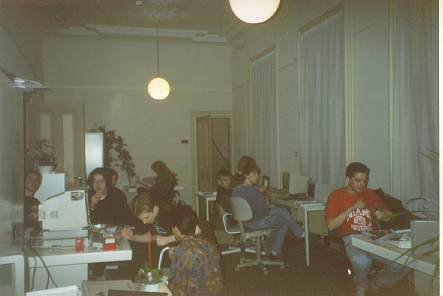 On the day before the actual convention. From left to right: ?, Spaz, possibly part of Rob "Quartet" Povey's head obscures by Spaz, Tanis, Sprog sitting in the back, Gogo from the back, Jas looking into the camera, Nic, Oxygene in blue and Stefan.